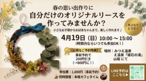確定申告お悩み相談 2026 3/09 イベント 2026年3月9日 イベント 姫石の湯だより 2026.3月号 【受付中】春のリース作り体験 関連記事 【受付中】春のリース作り体験 2026年4月19日