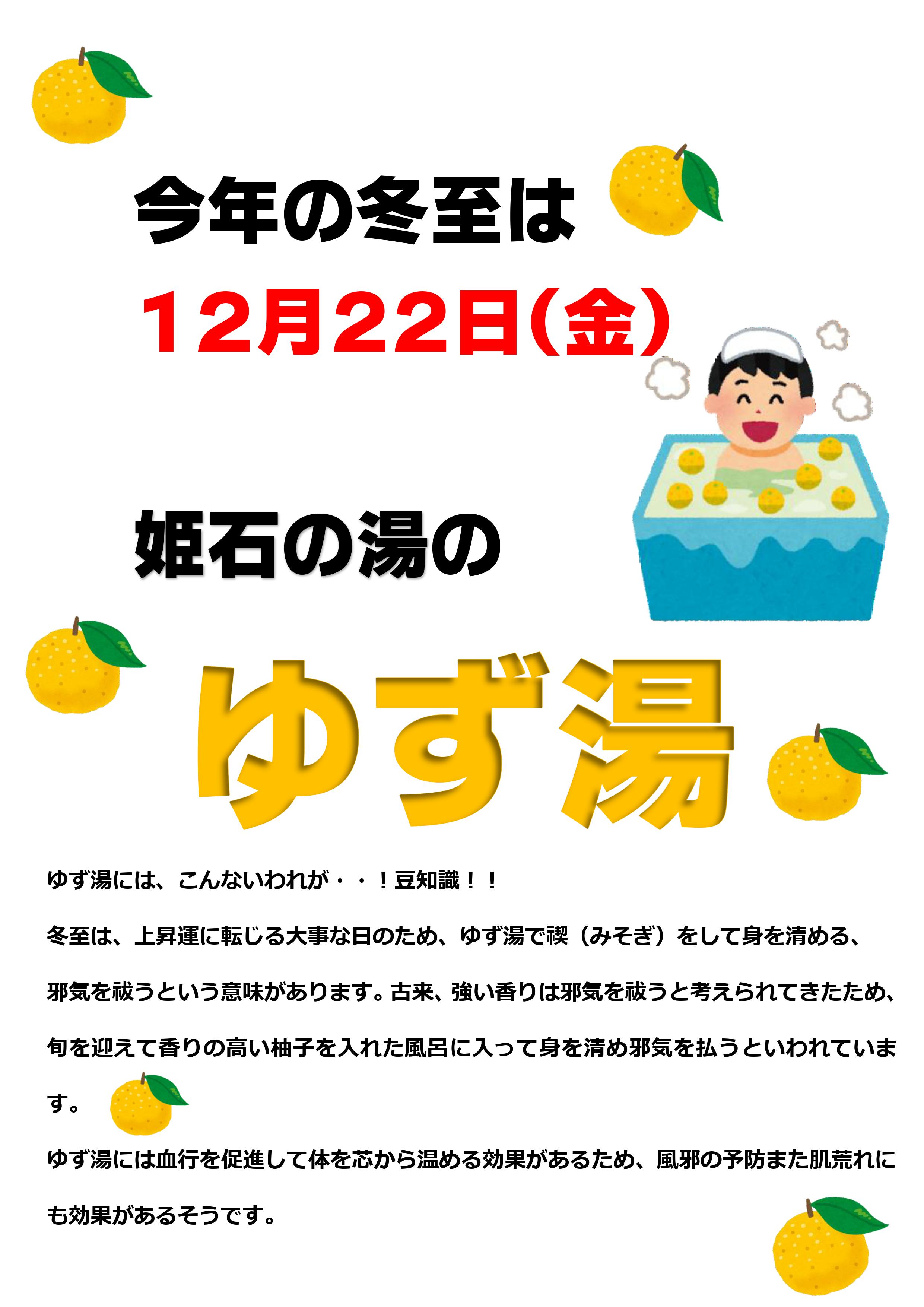 姫石の湯のゆず湯 2025 12/22 お知らせ 2023年12月20日2025年12月22日 お知らせ 姫石の湯だより2023.12月(再) 姫石の湯だより 2024.1月号 関連記事 ホームページリニューアルのお知らせ 2025年12月22日 ゆず湯のお知らせ 2025.12.22(月) 2025年12月14日 年末感謝祭のお知らせ 2025.12.21(日) 2025年12月14日 姫石の湯だより 2025.12月号 2025年12月1日 ご入浴回数券特別価格販売のお知らせ 2025年11月21日 臨時休業 時短営業のお知らせ 2025年11月21日 姫石の湯だより 2025.11月号 2025年11月12日 姫石の湯だより 2025.9月号 2025年9月1日