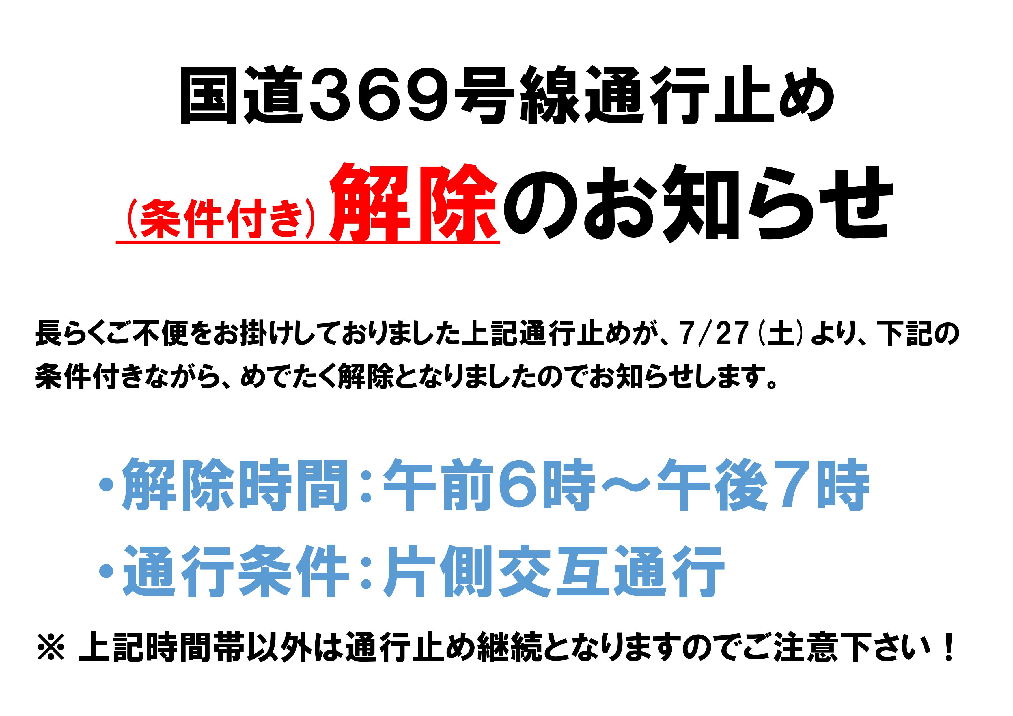 国道369号線曽爾村山粕地内通行止め部分解除のおしらせ 2025 12/22 お知らせ 2024年7月27日2025年12月22日 ご迷惑をおかけしておりました通行止めが7月27日(土)より部分的に解除となりました。 当道の駅、御杖村へお越しの際はどうぞお気をつけお越しくださいませ。 お知らせ 7/21(日) 誕生祭を開催します。 お盆特別営業と振替休業のお知らせ 関連記事 ホームページリニューアルのお知らせ 2025年12月22日 ゆず湯のお知らせ 2025.12.22(月) 2025年12月14日 年末感謝祭のお知らせ 2025.12.21(日) 2025年12月14日 姫石の湯だより 2025.12月号 2025年12月1日 ご入浴回数券特別価格販売のお知らせ 2025年11月21日 臨時休業 時短営業のお知らせ 2025年11月21日 姫石の湯だより 2025.11月号 2025年11月12日 姫石の湯だより 2025.9月号 2025年9月1日