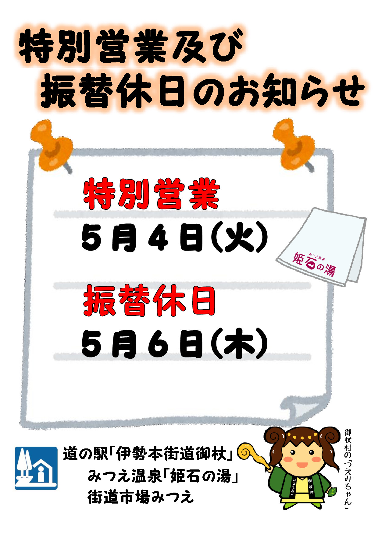 特別営業及び振替休日のお知らせ 2025 12/22 お知らせ 2021年4月26日2025年12月22日 お知らせ おいしいもの販売所 メンテナンス休業のお知らせ 関連記事 ホームページリニューアルのお知らせ 2025年12月22日 ゆず湯のお知らせ 2025.12.22(月) 2025年12月14日 年末感謝祭のお知らせ 2025.12.21(日) 2025年12月14日 姫石の湯だより 2025.12月号 2025年12月1日 ご入浴回数券特別価格販売のお知らせ 2025年11月21日 臨時休業 時短営業のお知らせ 2025年11月21日 姫石の湯だより 2025.11月号 2025年11月12日 姫石の湯だより 2025.9月号 2025年9月1日
