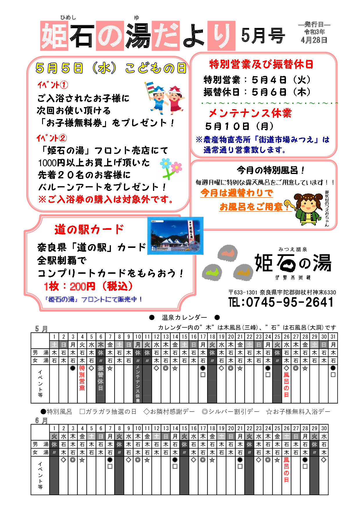 姫石の湯だより5月号 2025 12/22 お知らせ 2021年5月5日2025年12月22日 お知らせ メンテナンス休業のお知らせ 御杖村の「つえみちゃん」オリジナルグッズ新発売! 関連記事 ホームページリニューアルのお知らせ 2025年12月22日 ゆず湯のお知らせ 2025.12.22(月) 2025年12月14日 年末感謝祭のお知らせ 2025.12.21(日) 2025年12月14日 姫石の湯だより 2025.12月号 2025年12月1日 ご入浴回数券特別価格販売のお知らせ 2025年11月21日 臨時休業 時短営業のお知らせ 2025年11月21日 姫石の湯だより 2025.11月号 2025年11月12日 姫石の湯だより 2025.9月号 2025年9月1日