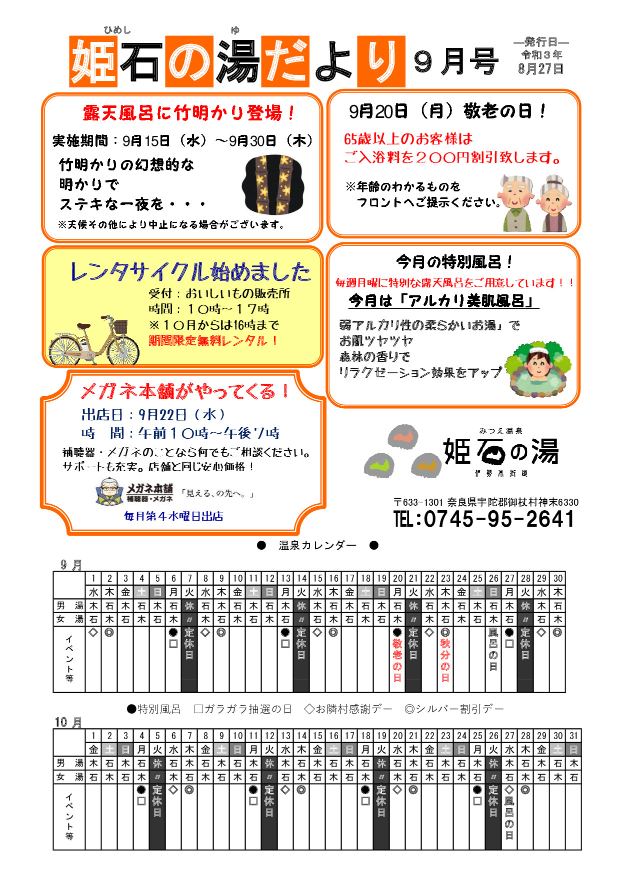 姫石の湯だより9月号 2025 12/22 お知らせ 2021年9月3日2025年12月22日 お知らせ レンタサイクル始めました! メガネ本舗がやってくる! 関連記事 ホームページリニューアルのお知らせ 2025年12月22日 ゆず湯のお知らせ 2025.12.22(月) 2025年12月14日 年末感謝祭のお知らせ 2025.12.21(日) 2025年12月14日 姫石の湯だより 2025.12月号 2025年12月1日 ご入浴回数券特別価格販売のお知らせ 2025年11月21日 臨時休業 時短営業のお知らせ 2025年11月21日 姫石の湯だより 2025.11月号 2025年11月12日 姫石の湯だより 2025.9月号 2025年9月1日