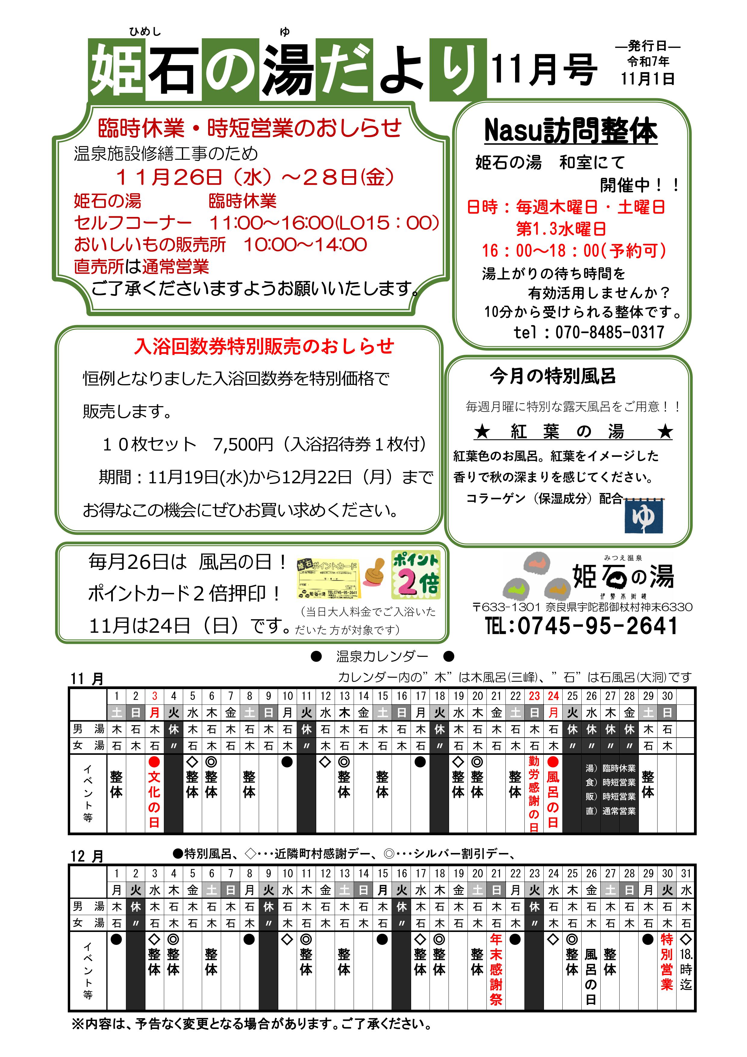 姫石の湯だより 2025.11月号 2025 12/22 お知らせ 2025年11月12日2025年12月22日 お知らせ 姫石の湯だより 2025.9月号 臨時休業 時短営業のお知らせ 関連記事 ホームページリニューアルのお知らせ 2025年12月22日 ゆず湯のお知らせ 2025.12.22(月) 2025年12月14日 年末感謝祭のお知らせ 2025.12.21(日) 2025年12月14日 姫石の湯だより 2025.12月号 2025年12月1日 ご入浴回数券特別価格販売のお知らせ 2025年11月21日 臨時休業 時短営業のお知らせ 2025年11月21日 姫石の湯だより 2025.9月号 2025年9月1日 姫石の湯だより 2025.8月号 2025年8月2日