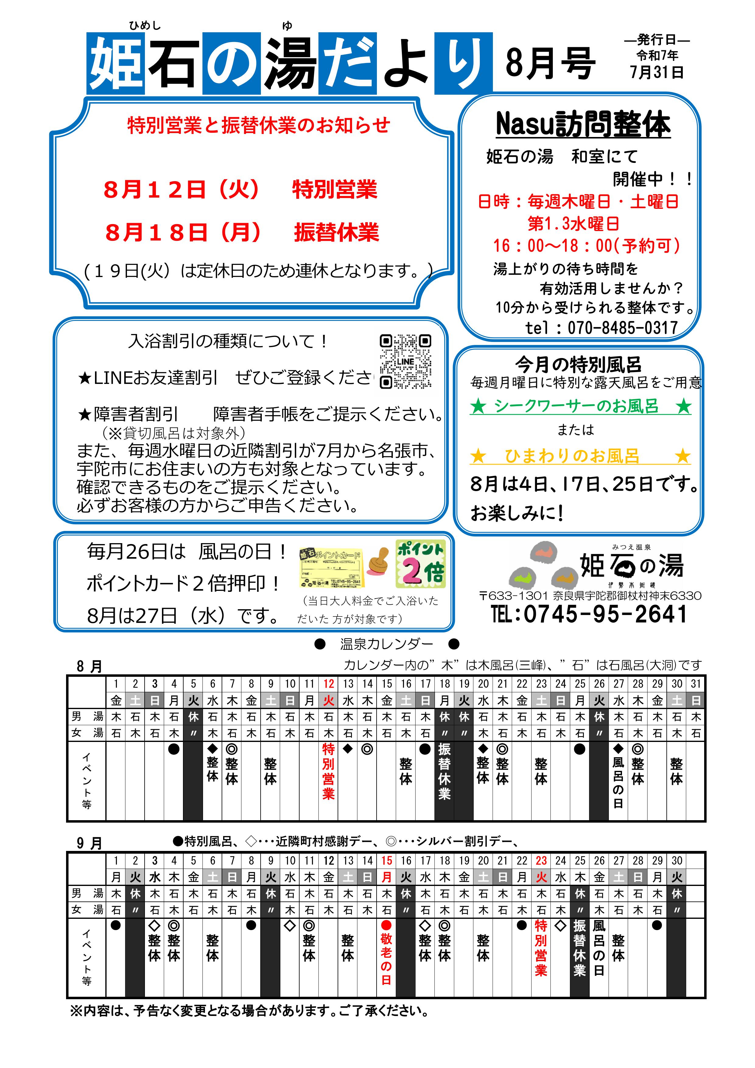 姫石の湯だより 2025.8月号 2025 12/22 お知らせ 2025年8月2日2025年12月22日 お知らせ サヤインゲン入荷しました 姫石の湯だより 2025.9月号 関連記事 ホームページリニューアルのお知らせ 2025年12月22日 ゆず湯のお知らせ 2025.12.22(月) 2025年12月14日 年末感謝祭のお知らせ 2025.12.21(日) 2025年12月14日 姫石の湯だより 2025.12月号 2025年12月1日 ご入浴回数券特別価格販売のお知らせ 2025年11月21日 臨時休業 時短営業のお知らせ 2025年11月21日 姫石の湯だより 2025.11月号 2025年11月12日 姫石の湯だより 2025.9月号 2025年9月1日