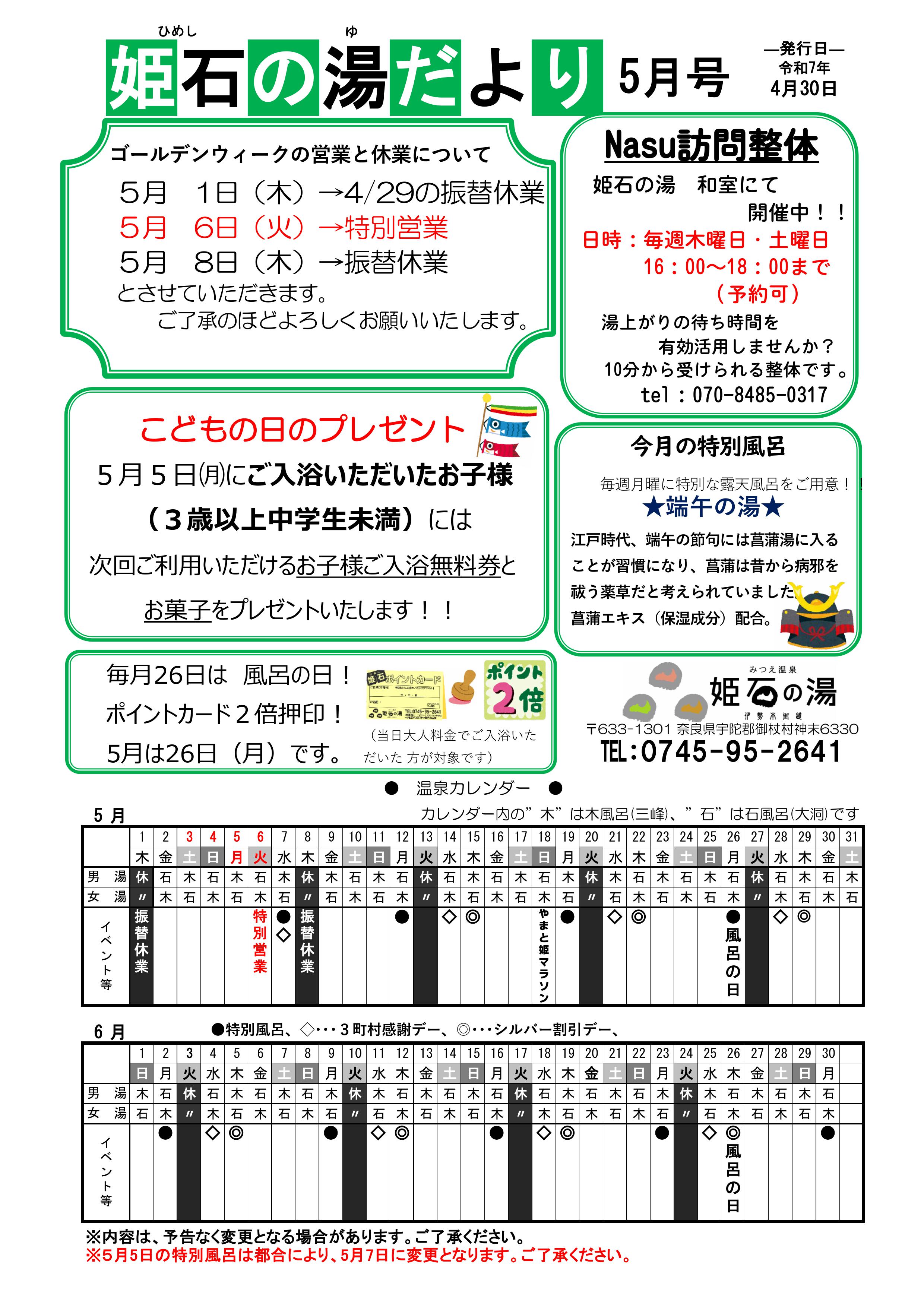 姫石の湯だより 2025.5月号 2025 12/22 お知らせ 2025年5月1日2025年12月22日 お知らせ 2025年 ゴールデンウィークの営業と休業のお知らせ 姫石の湯だより 2025.6月号 関連記事 ホームページリニューアルのお知らせ 2025年12月22日 ゆず湯のお知らせ 2025.12.22(月) 2025年12月14日 年末感謝祭のお知らせ 2025.12.21(日) 2025年12月14日 姫石の湯だより 2025.12月号 2025年12月1日 ご入浴回数券特別価格販売のお知らせ 2025年11月21日 臨時休業 時短営業のお知らせ 2025年11月21日 姫石の湯だより 2025.11月号 2025年11月12日 姫石の湯だより 2025.9月号 2025年9月1日