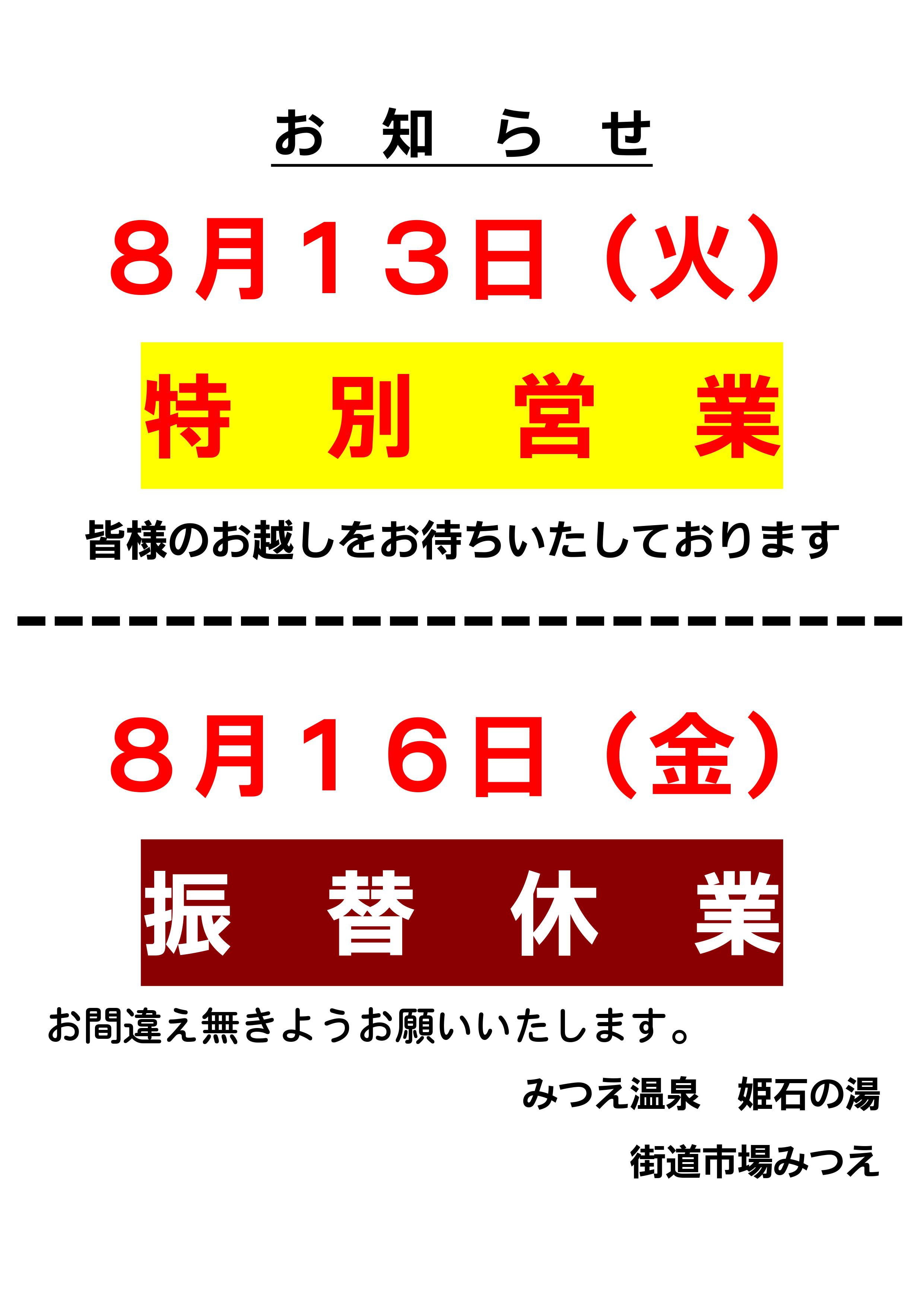 お盆特別営業と振替休業のお知らせ 2025 12/22 お知らせ 2024年8月10日2025年12月22日 いつもご利用いただきありがとうございます。 姫石の湯、および街道市場みつえは下記の通り特別営業と振替休業となります。 お知らせ 国道369号線曽爾村山粕地内通行止め部分解除のおしらせ 【おしらせ】8月31日(土)通常営業のお知らせ 関連記事 ホームページリニューアルのお知らせ 2025年12月22日 ゆず湯のお知らせ 2025.12.22(月) 2025年12月14日 年末感謝祭のお知らせ 2025.12.21(日) 2025年12月14日 姫石の湯だより 2025.12月号 2025年12月1日 ご入浴回数券特別価格販売のお知らせ 2025年11月21日 臨時休業 時短営業のお知らせ 2025年11月21日 姫石の湯だより 2025.11月号 2025年11月12日 姫石の湯だより 2025.9月号 2025年9月1日