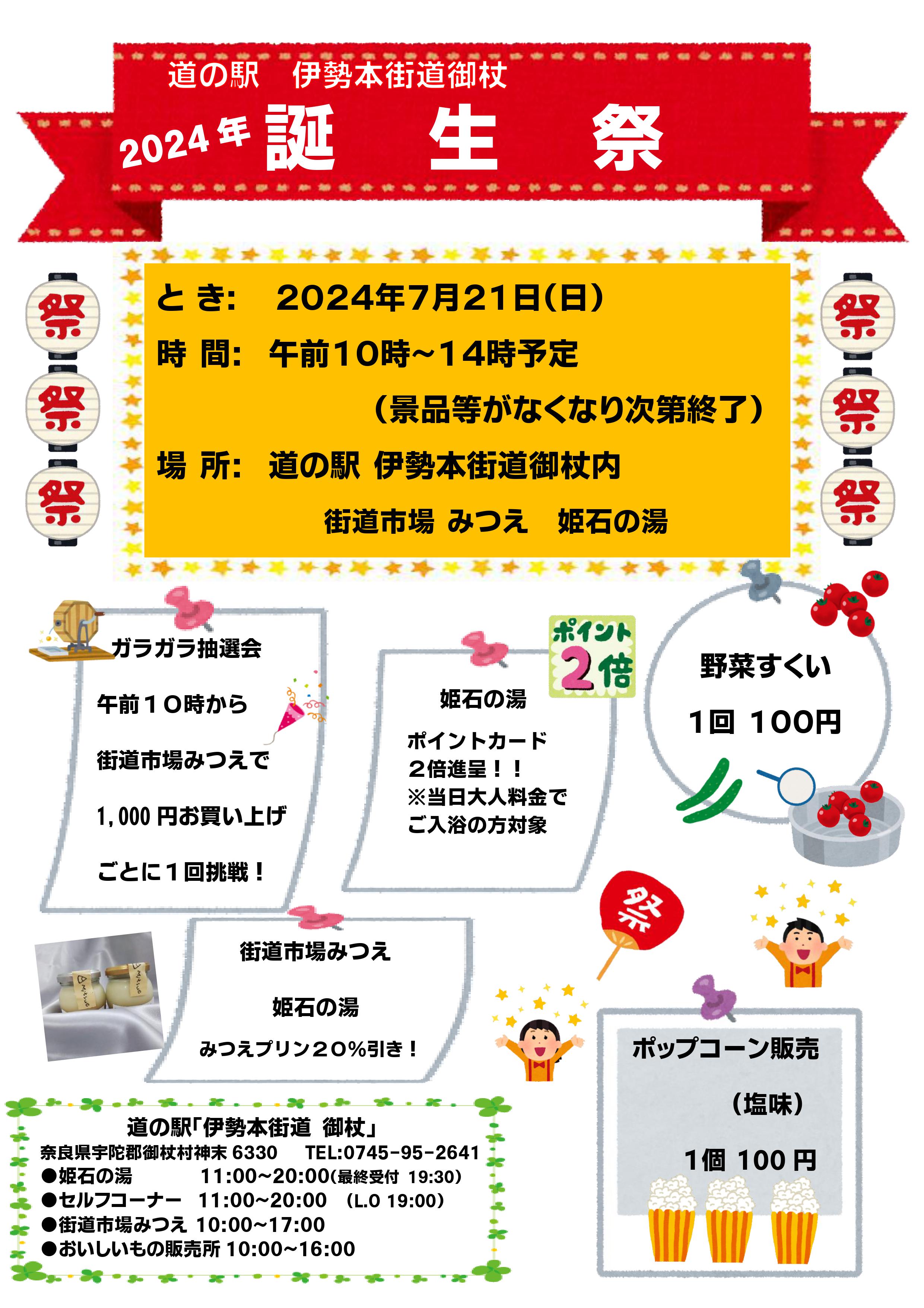7/21(日) 誕生祭を開催します。 2025 12/22 お知らせ 2024年7月20日2025年12月22日 お知らせ 7/20スタート 御杖村御朱印スタンプラリーに協賛しています。 国道369号線曽爾村山粕地内通行止め部分解除のおしらせ 関連記事 ホームページリニューアルのお知らせ 2025年12月22日 ゆず湯のお知らせ 2025.12.22(月) 2025年12月14日 年末感謝祭のお知らせ 2025.12.21(日) 2025年12月14日 姫石の湯だより 2025.12月号 2025年12月1日 ご入浴回数券特別価格販売のお知らせ 2025年11月21日 臨時休業 時短営業のお知らせ 2025年11月21日 姫石の湯だより 2025.11月号 2025年11月12日 姫石の湯だより 2025.9月号 2025年9月1日