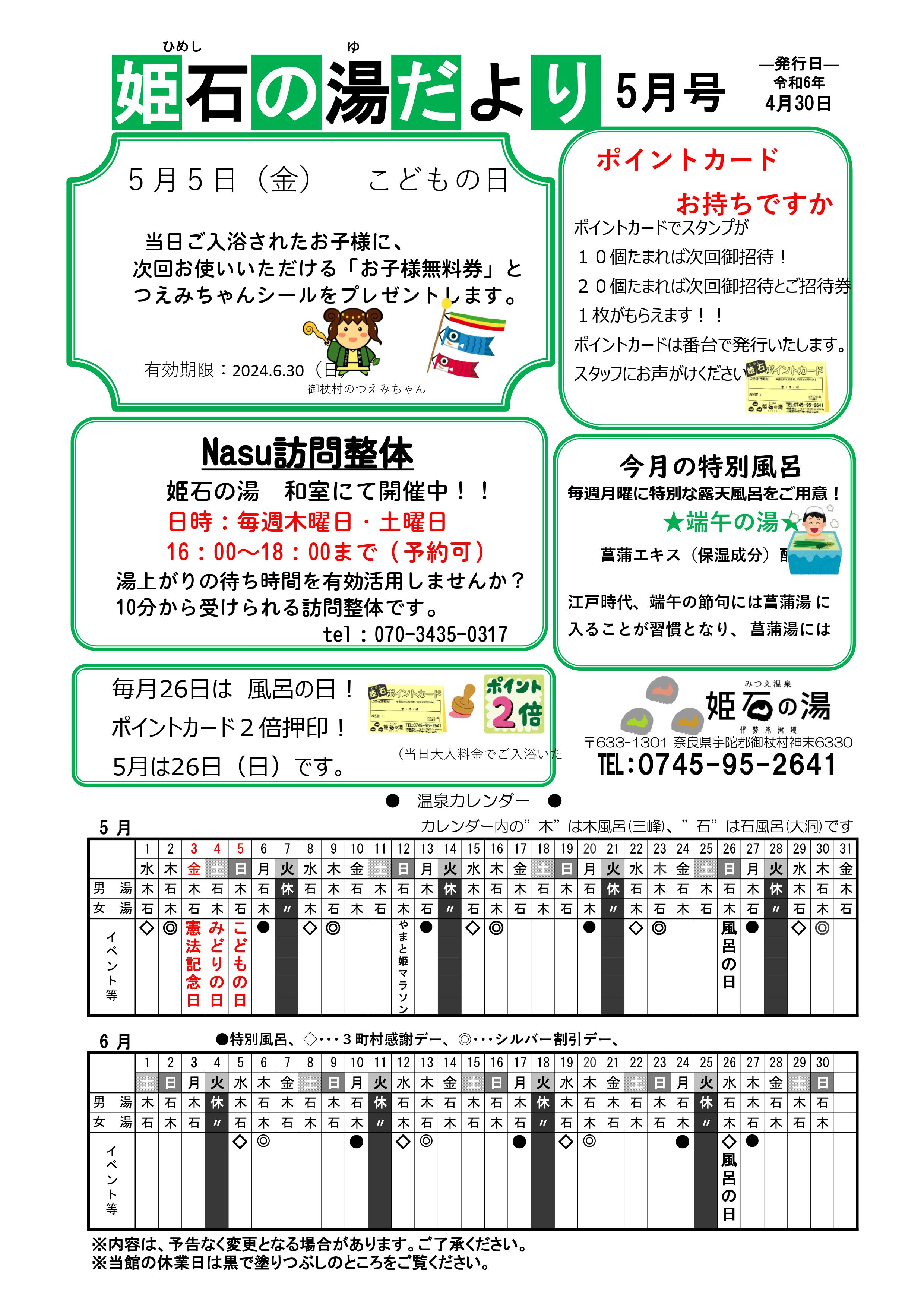 姫石の湯だより 2024.5月号 2025 12/22 お知らせ 2024年4月30日2025年12月22日 お知らせ 2024.3.24(日)春待ち祭 開催!! 姫石の湯だより 2024.7月号 関連記事 ホームページリニューアルのお知らせ 2025年12月22日 ゆず湯のお知らせ 2025.12.22(月) 2025年12月14日 年末感謝祭のお知らせ 2025.12.21(日) 2025年12月14日 姫石の湯だより 2025.12月号 2025年12月1日 ご入浴回数券特別価格販売のお知らせ 2025年11月21日 臨時休業 時短営業のお知らせ 2025年11月21日 姫石の湯だより 2025.11月号 2025年11月12日 姫石の湯だより 2025.9月号 2025年9月1日