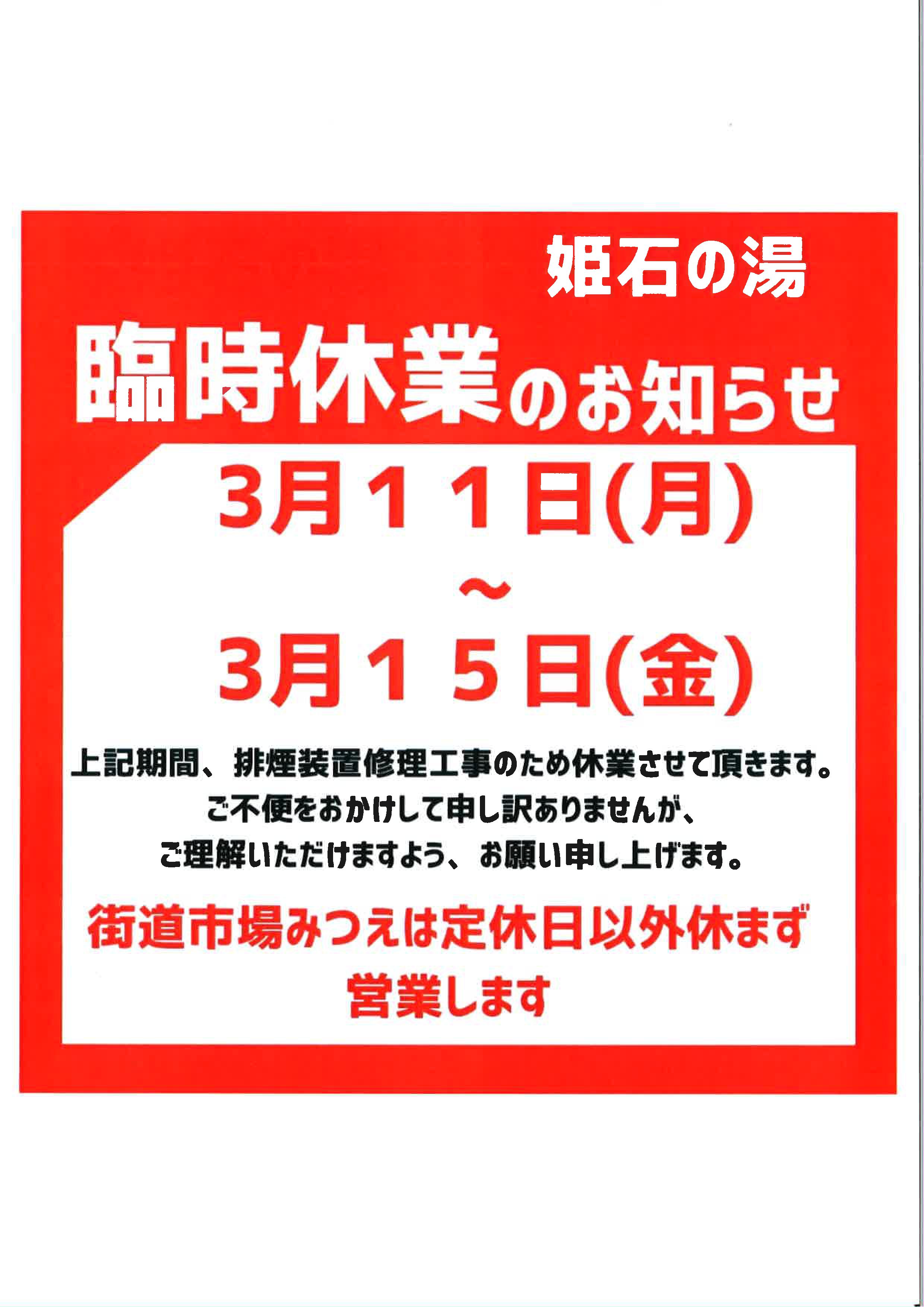 臨時休業のお知らせ 3/11-3/15 2025 12/22 お知らせ 2024年3月9日2025年12月22日 お知らせ 姫石の湯だより 2024.3月号 義援金第2回週計 ご協力ありがとうございます。引き続きよろしくお願いいたします。 関連記事 ホームページリニューアルのお知らせ 2025年12月22日 ゆず湯のお知らせ 2025.12.22(月) 2025年12月14日 年末感謝祭のお知らせ 2025.12.21(日) 2025年12月14日 姫石の湯だより 2025.12月号 2025年12月1日 ご入浴回数券特別価格販売のお知らせ 2025年11月21日 臨時休業 時短営業のお知らせ 2025年11月21日 姫石の湯だより 2025.11月号 2025年11月12日 姫石の湯だより 2025.9月号 2025年9月1日