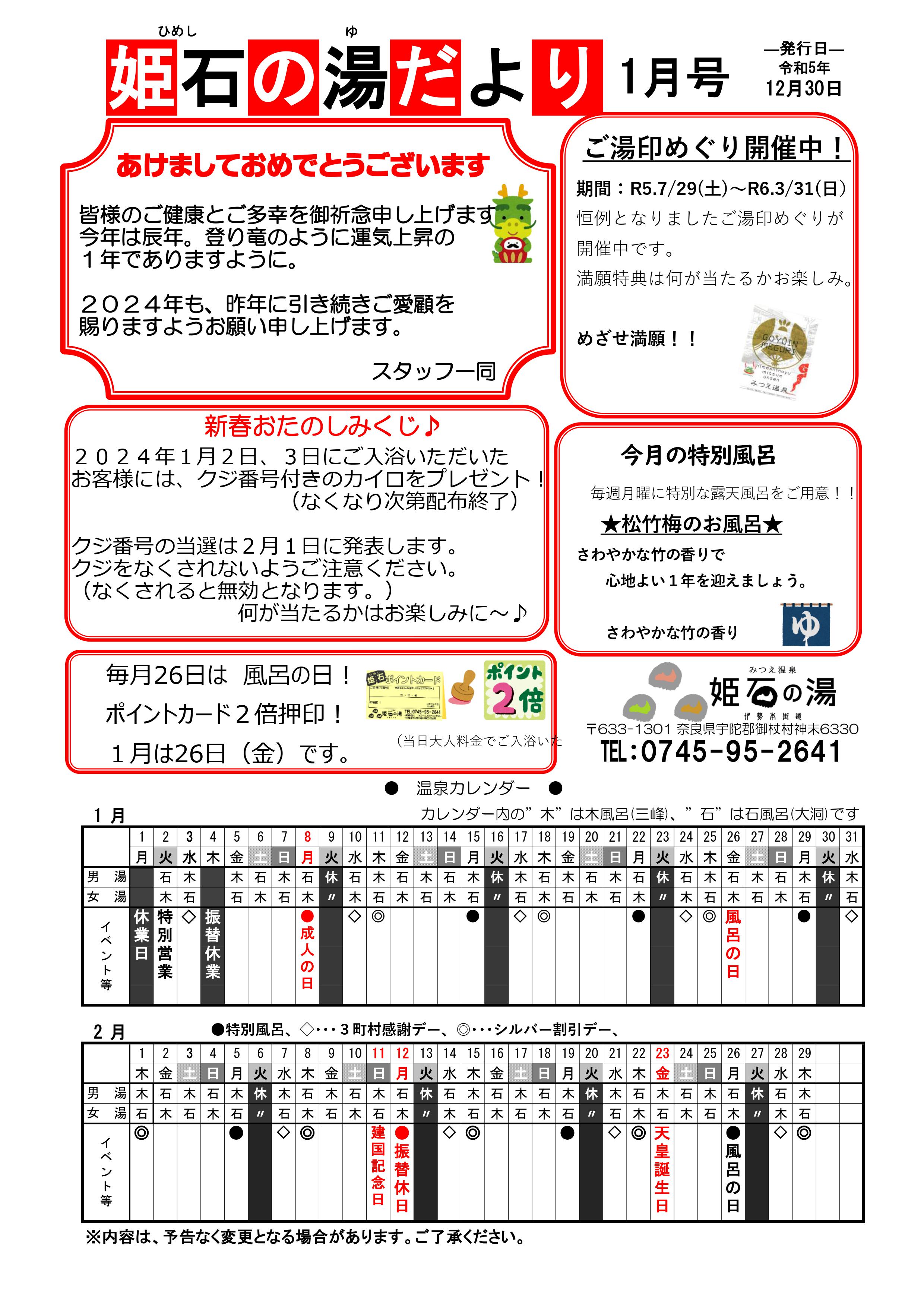 姫石の湯だより 2024.1月号 2025 12/22 お知らせ 2023年12月30日2025年12月22日 お知らせ 姫石の湯のゆず湯 令和6年能登半島地震義援金募金にご協力お願いします。 関連記事 ホームページリニューアルのお知らせ 2025年12月22日 ゆず湯のお知らせ 2025.12.22(月) 2025年12月14日 年末感謝祭のお知らせ 2025.12.21(日) 2025年12月14日 姫石の湯だより 2025.12月号 2025年12月1日 ご入浴回数券特別価格販売のお知らせ 2025年11月21日 臨時休業 時短営業のお知らせ 2025年11月21日 姫石の湯だより 2025.11月号 2025年11月12日 姫石の湯だより 2025.9月号 2025年9月1日