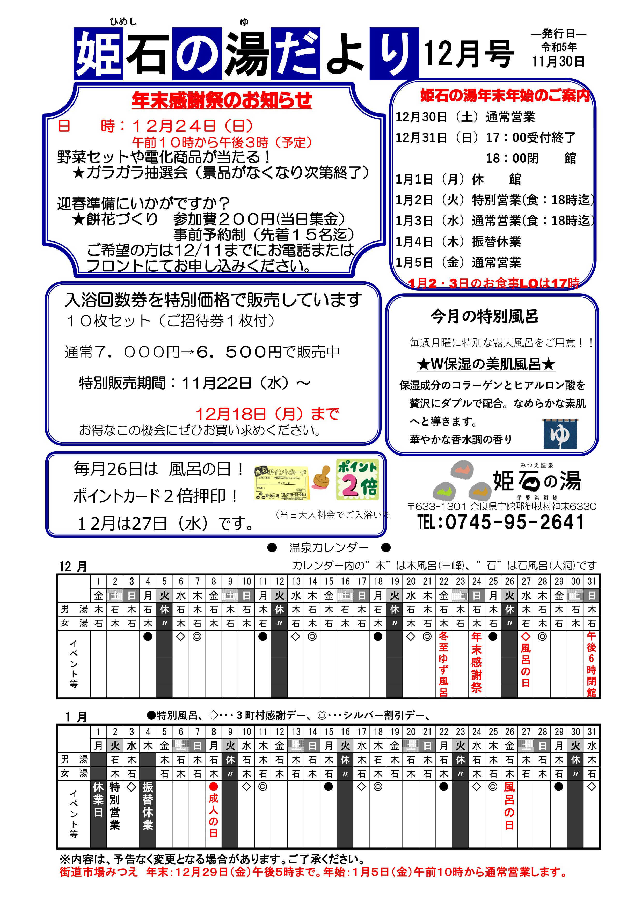 姫石の湯だより2023.12月(再) 2025 12/22 お知らせ 2023年12月4日2025年12月22日 お知らせ 年末感謝祭のお知らせ 姫石の湯のゆず湯 関連記事 ホームページリニューアルのお知らせ 2025年12月22日 ゆず湯のお知らせ 2025.12.22(月) 2025年12月14日 年末感謝祭のお知らせ 2025.12.21(日) 2025年12月14日 姫石の湯だより 2025.12月号 2025年12月1日 ご入浴回数券特別価格販売のお知らせ 2025年11月21日 臨時休業 時短営業のお知らせ 2025年11月21日 姫石の湯だより 2025.11月号 2025年11月12日 姫石の湯だより 2025.9月号 2025年9月1日