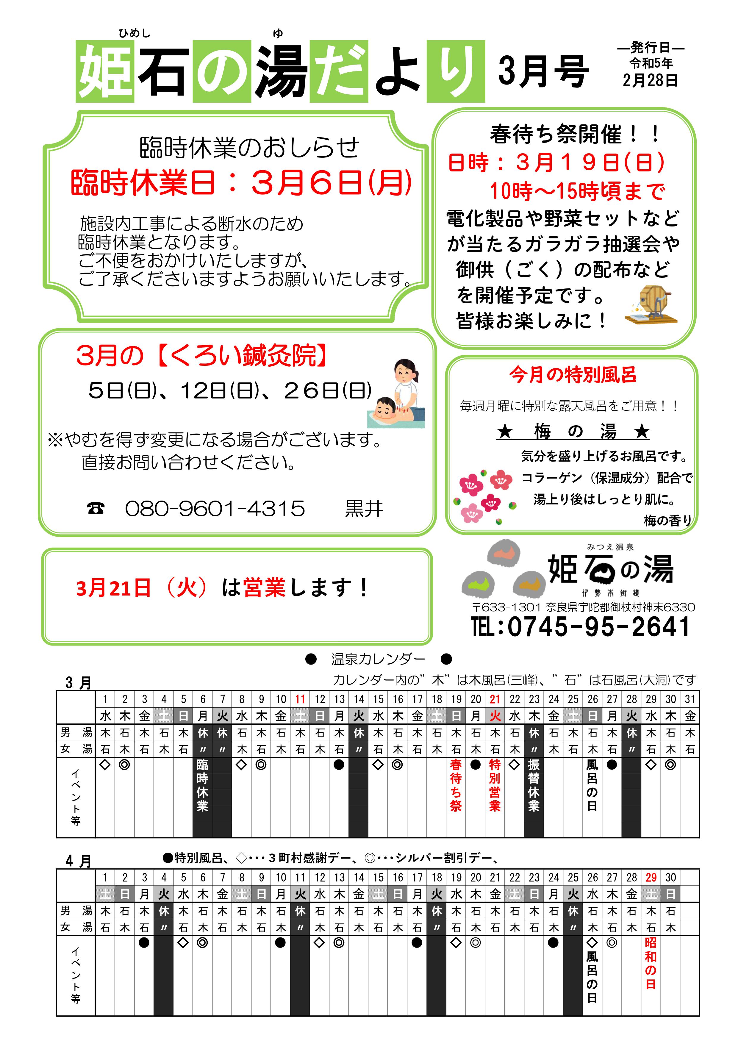 姫石の湯だより 2023.3月号 2025 12/22 お知らせ 2023年2月27日2025年12月22日 お知らせ 春待ち祭のお知らせ 姫石の湯だより2023.4月豪 関連記事 ホームページリニューアルのお知らせ 2025年12月22日 ゆず湯のお知らせ 2025.12.22(月) 2025年12月14日 年末感謝祭のお知らせ 2025.12.21(日) 2025年12月14日 姫石の湯だより 2025.12月号 2025年12月1日 ご入浴回数券特別価格販売のお知らせ 2025年11月21日 臨時休業 時短営業のお知らせ 2025年11月21日 姫石の湯だより 2025.11月号 2025年11月12日 姫石の湯だより 2025.9月号 2025年9月1日