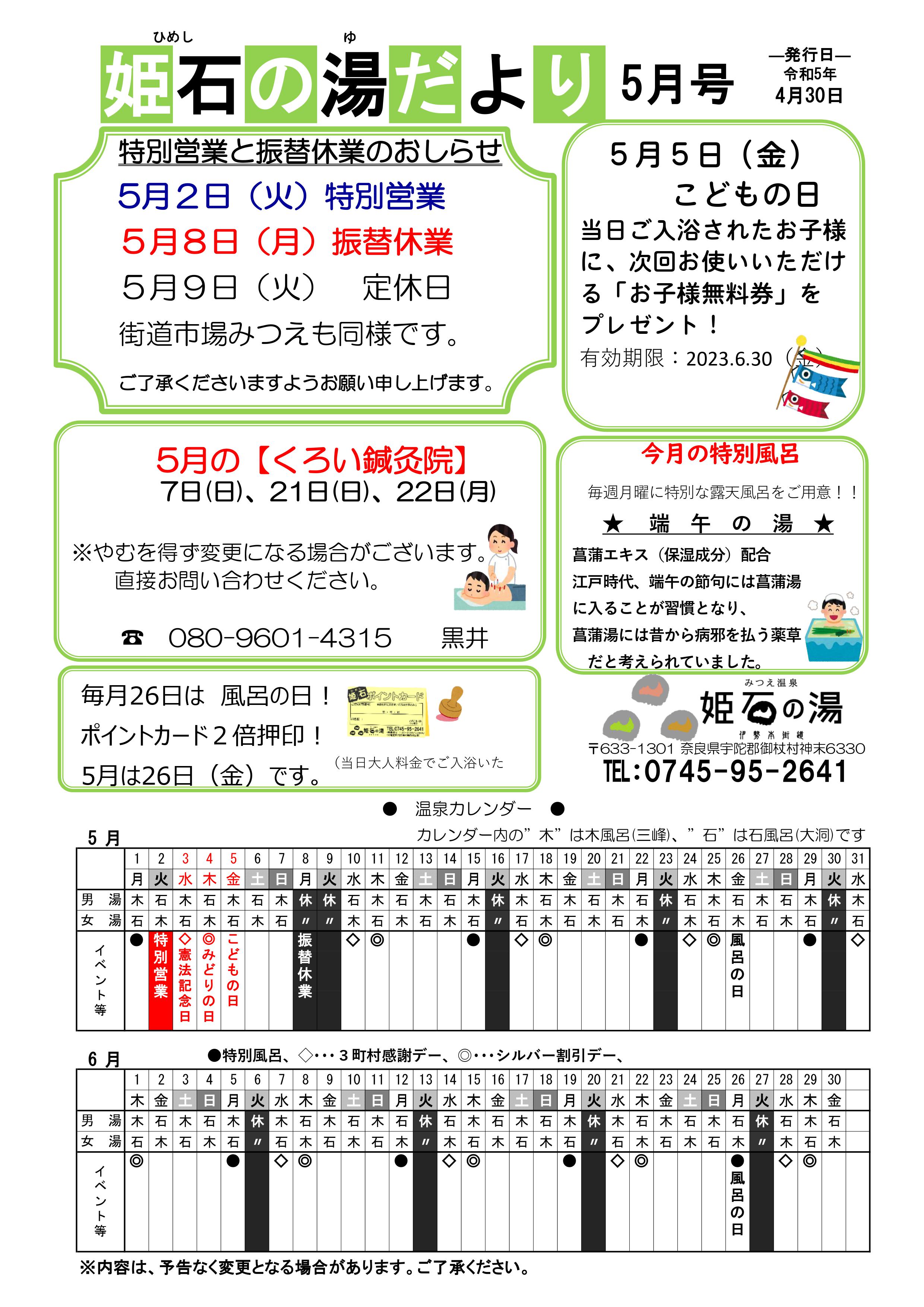 姫石の湯だより 2023.5月号 2025 12/22 お知らせ 2023年4月30日2025年12月22日 お知らせ 姫石の湯だより2023.4月豪 休業日のお知らせ 関連記事 ホームページリニューアルのお知らせ 2025年12月22日 ゆず湯のお知らせ 2025.12.22(月) 2025年12月14日 年末感謝祭のお知らせ 2025.12.21(日) 2025年12月14日 姫石の湯だより 2025.12月号 2025年12月1日 ご入浴回数券特別価格販売のお知らせ 2025年11月21日 臨時休業 時短営業のお知らせ 2025年11月21日 姫石の湯だより 2025.11月号 2025年11月12日 姫石の湯だより 2025.9月号 2025年9月1日