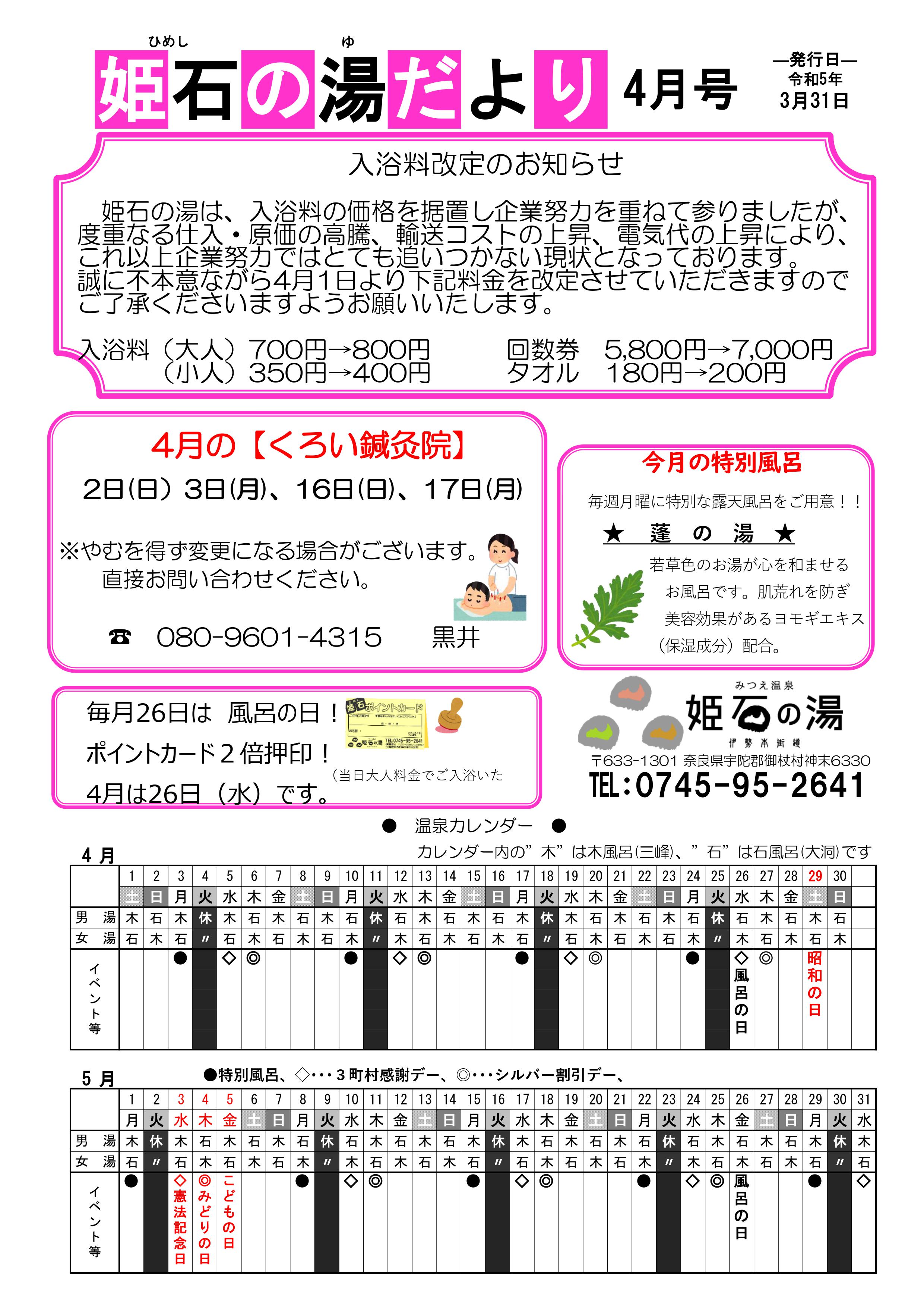 姫石の湯だより2023.4月豪 2025 12/22 お知らせ 2023年4月9日2025年12月22日 お知らせ 姫石の湯だより 2023.3月号 姫石の湯だより 2023.5月号 関連記事 ホームページリニューアルのお知らせ 2025年12月22日 ゆず湯のお知らせ 2025.12.22(月) 2025年12月14日 年末感謝祭のお知らせ 2025.12.21(日) 2025年12月14日 姫石の湯だより 2025.12月号 2025年12月1日 ご入浴回数券特別価格販売のお知らせ 2025年11月21日 臨時休業 時短営業のお知らせ 2025年11月21日 姫石の湯だより 2025.11月号 2025年11月12日 姫石の湯だより 2025.9月号 2025年9月1日