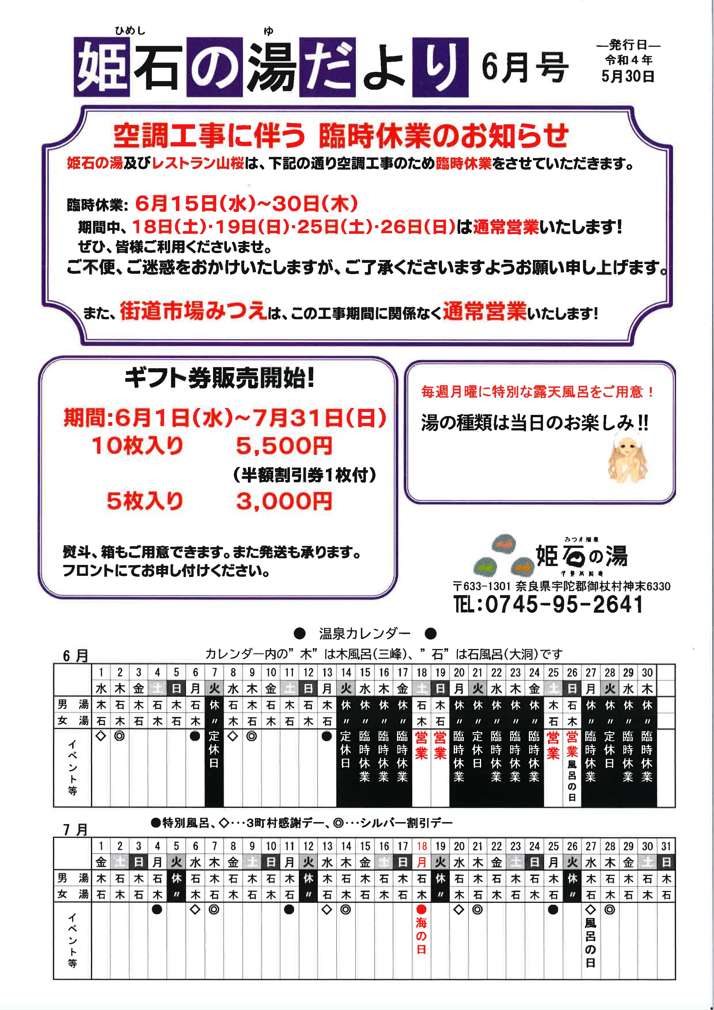 姫石の湯だより 6月号 2025 12/22 お知らせ 2022年6月11日2025年12月22日 お知らせ 【お詫び】みつえ青少年旅行村ご予約の件 営業再開のお知らせ 関連記事 ホームページリニューアルのお知らせ 2025年12月22日 ゆず湯のお知らせ 2025.12.22(月) 2025年12月14日 年末感謝祭のお知らせ 2025.12.21(日) 2025年12月14日 姫石の湯だより 2025.12月号 2025年12月1日 ご入浴回数券特別価格販売のお知らせ 2025年11月21日 臨時休業 時短営業のお知らせ 2025年11月21日 姫石の湯だより 2025.11月号 2025年11月12日 姫石の湯だより 2025.9月号 2025年9月1日