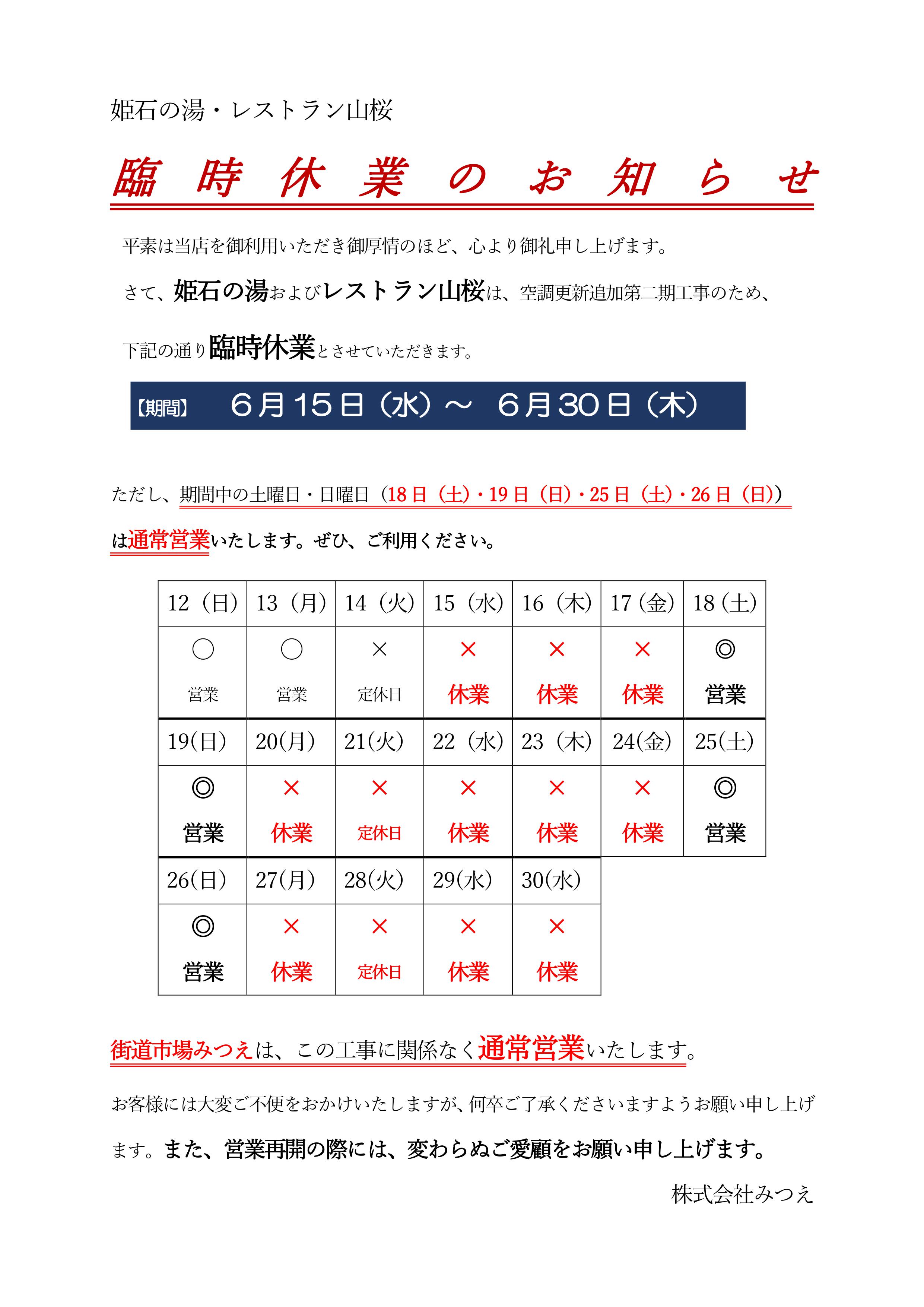 臨時休業のお知らせ(姫石の湯・レストラン山桜) 2025 12/22 お知らせ 2022年5月22日2025年12月22日 お知らせ ボブスレー営業再開のお知らせ 【お詫び】みつえ青少年旅行村ご予約の件 関連記事 ホームページリニューアルのお知らせ 2025年12月22日 ゆず湯のお知らせ 2025.12.22(月) 2025年12月14日 年末感謝祭のお知らせ 2025.12.21(日) 2025年12月14日 姫石の湯だより 2025.12月号 2025年12月1日 ご入浴回数券特別価格販売のお知らせ 2025年11月21日 臨時休業 時短営業のお知らせ 2025年11月21日 姫石の湯だより 2025.11月号 2025年11月12日 姫石の湯だより 2025.9月号 2025年9月1日
