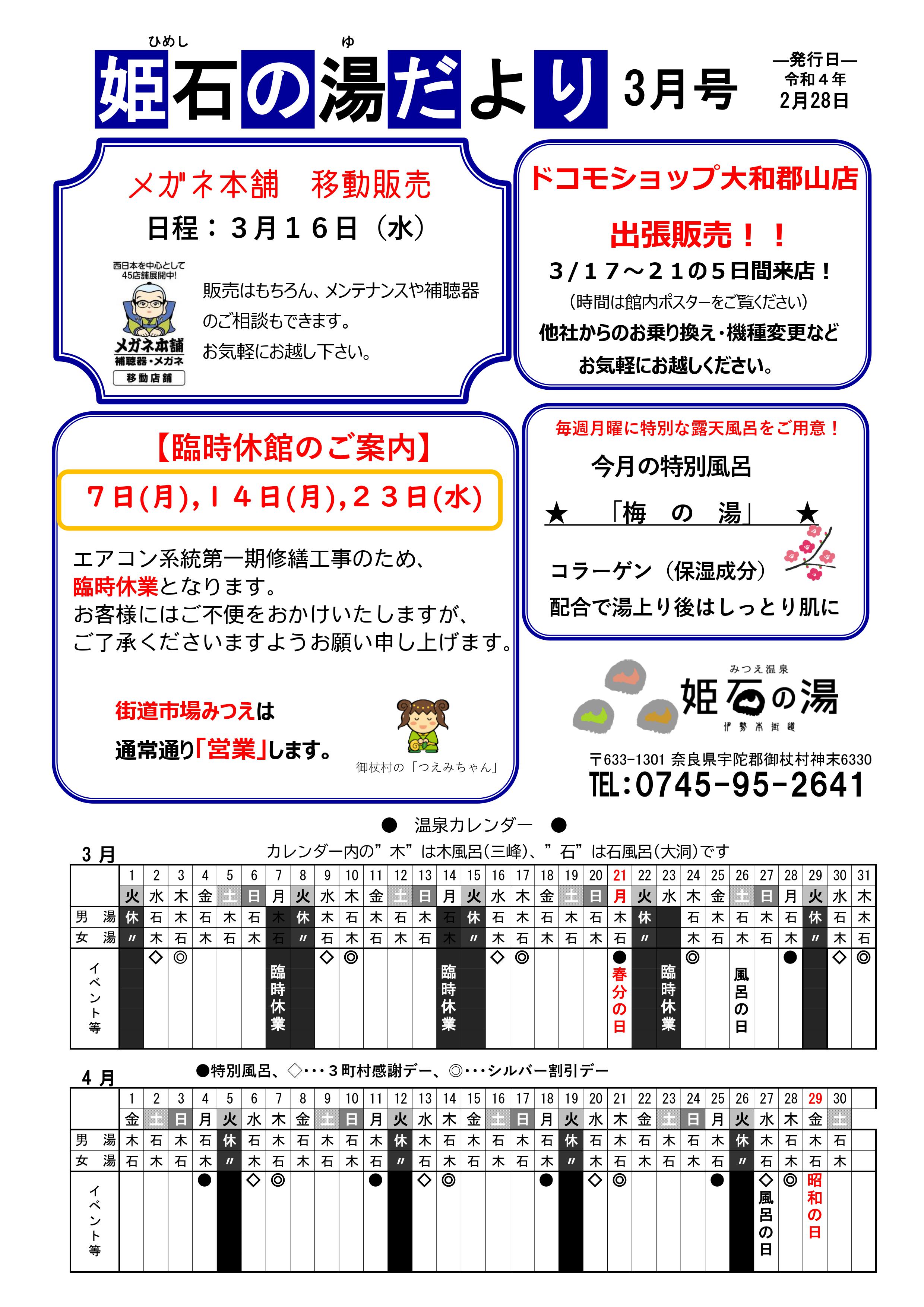 温泉だより 2022.3月号 2025 12/22 お知らせ 2022年2月28日2025年12月22日 お知らせ 価格改定のお知らせ (再)温泉だより3月号 関連記事 ホームページリニューアルのお知らせ 2025年12月22日 ゆず湯のお知らせ 2025.12.22(月) 2025年12月14日 年末感謝祭のお知らせ 2025.12.21(日) 2025年12月14日 姫石の湯だより 2025.12月号 2025年12月1日 ご入浴回数券特別価格販売のお知らせ 2025年11月21日 臨時休業 時短営業のお知らせ 2025年11月21日 姫石の湯だより 2025.11月号 2025年11月12日 姫石の湯だより 2025.9月号 2025年9月1日
