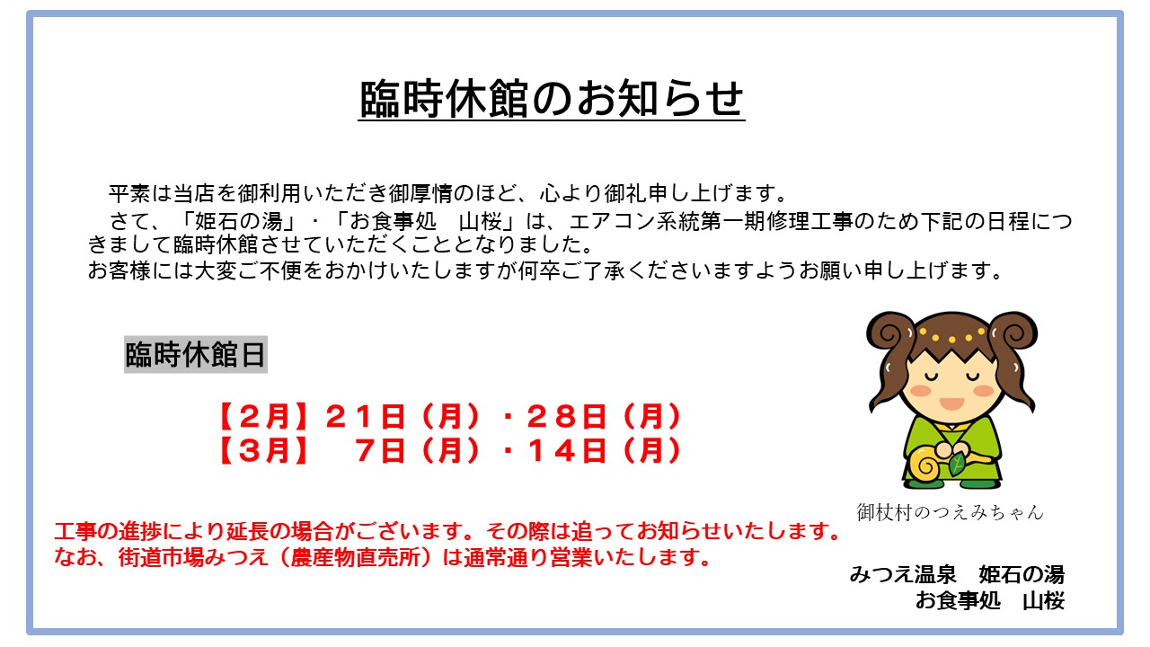 姫石の湯 臨時休館のお知らせ 2025 12/22 お知らせ 2022年2月7日2025年12月22日 お知らせ 姫石の湯だより2月号 価格改定のお知らせ 関連記事 ホームページリニューアルのお知らせ 2025年12月22日 ゆず湯のお知らせ 2025.12.22(月) 2025年12月14日 年末感謝祭のお知らせ 2025.12.21(日) 2025年12月14日 姫石の湯だより 2025.12月号 2025年12月1日 ご入浴回数券特別価格販売のお知らせ 2025年11月21日 臨時休業 時短営業のお知らせ 2025年11月21日 姫石の湯だより 2025.11月号 2025年11月12日 姫石の湯だより 2025.9月号 2025年9月1日