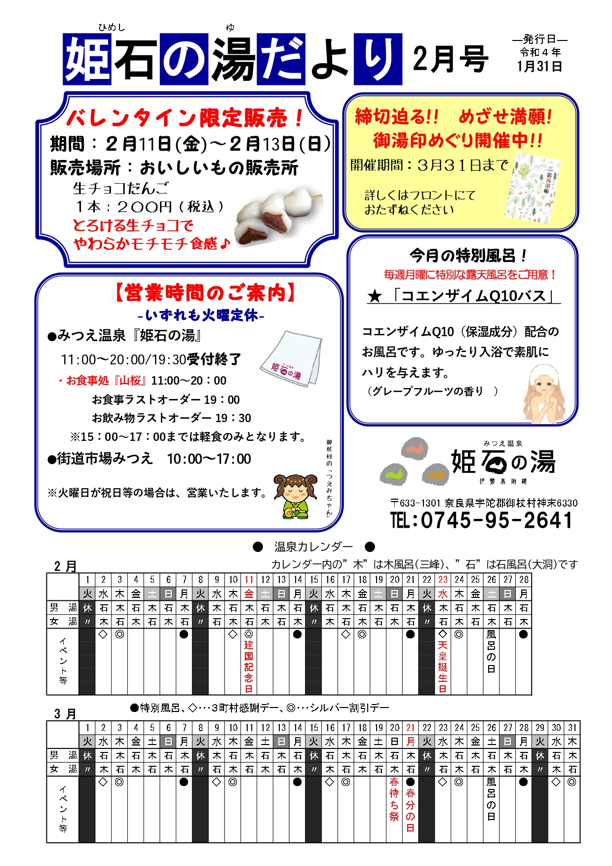 姫石の湯だより2月号 2025 12/22 お知らせ 2022年1月31日2025年12月22日 お知らせ 姫石の湯だより1月号 姫石の湯 臨時休館のお知らせ 関連記事 ホームページリニューアルのお知らせ 2025年12月22日 ゆず湯のお知らせ 2025.12.22(月) 2025年12月14日 年末感謝祭のお知らせ 2025.12.21(日) 2025年12月14日 姫石の湯だより 2025.12月号 2025年12月1日 ご入浴回数券特別価格販売のお知らせ 2025年11月21日 臨時休業 時短営業のお知らせ 2025年11月21日 姫石の湯だより 2025.11月号 2025年11月12日 姫石の湯だより 2025.9月号 2025年9月1日