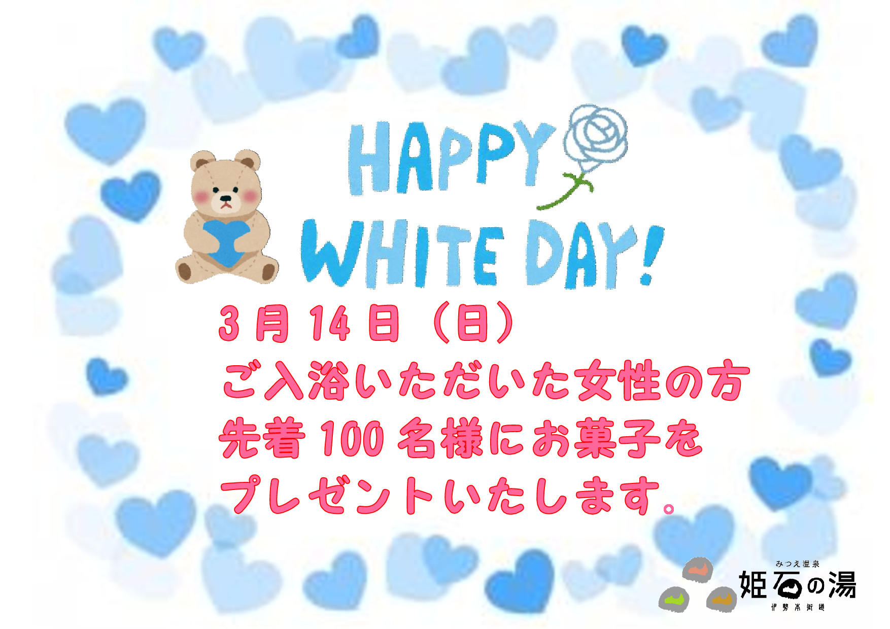 ホワイトデー 2025 12/22 お知らせ 2021年3月1日2025年12月22日 日頃の感謝を込めて 3月14日(日)ホワイトデーに ご入浴いただいた女性の方 限定100名様にお菓子をプレゼントいたします! お知らせ 姫石の湯だより3月号 春待ち祭のお知らせ 関連記事 ホームページリニューアルのお知らせ 2025年12月22日 ゆず湯のお知らせ 2025.12.22(月) 2025年12月14日 年末感謝祭のお知らせ 2025.12.21(日) 2025年12月14日 姫石の湯だより 2025.12月号 2025年12月1日 ご入浴回数券特別価格販売のお知らせ 2025年11月21日 臨時休業 時短営業のお知らせ 2025年11月21日 姫石の湯だより 2025.11月号 2025年11月12日 姫石の湯だより 2025.9月号 2025年9月1日