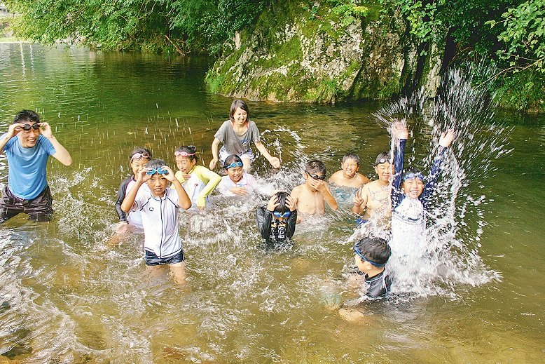 写真は、三季館前を流れる川遊びをしている様子になります。この川は、穏やかで、アマゴつかみに最適です。6月には蛍が飛び交い、幻想的な光景が広がります。